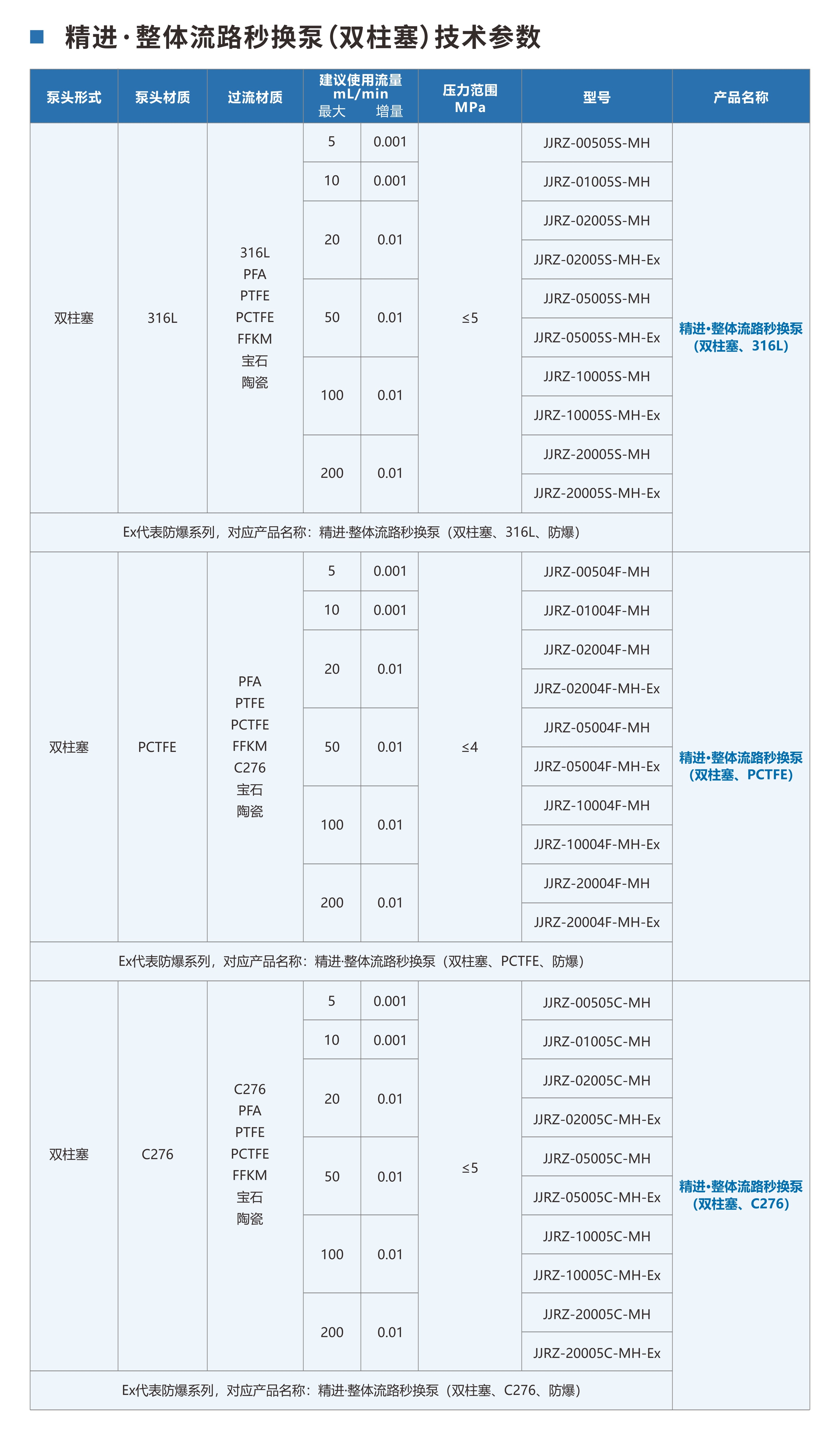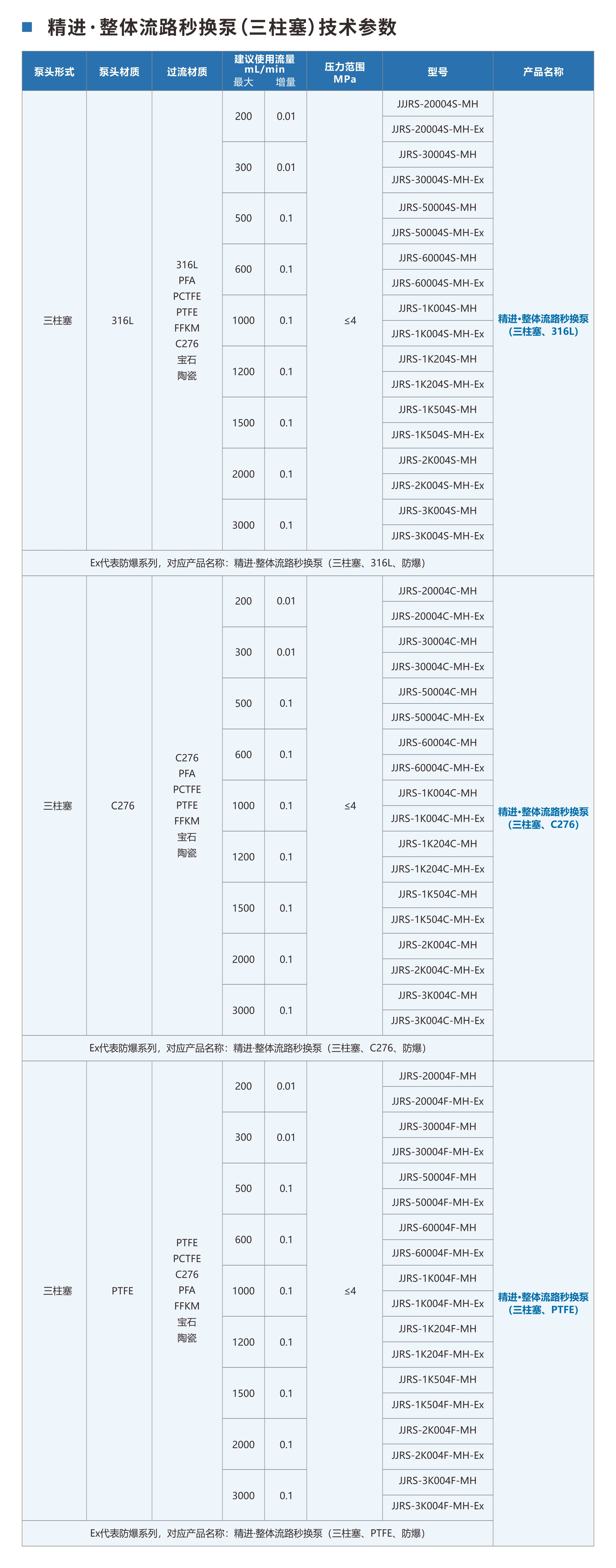 已获得发明专利11项,实用新型专利7项·技术创新:整体流路模块秒换,快速恢复实验与生产·产品系列:双柱塞、三柱塞·泵头材质:316L、C276、PCTFE、PTFE等·流量:0-3000mL/min·压力:0-5MPa·精度:±1%或者±0.02/0.05/0.1/1/2mL/min(取大,水)·防爆&非防爆&卫生级&无金属杂质·金属杂质析出:<1ppb(可选)·卫生级(可选)·实验不中断,生产不待机,流路专用无污染,秒换清洁更省心!